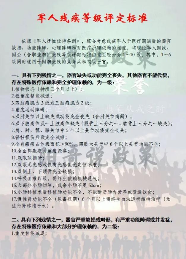 3、评定等级:分为一级至十级,其中一级为最高级别,更细化的等级有利于更准确地评定军人的残疾情况,给予他们应有的荣誉和待遇。